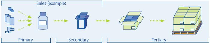 - Embalagem primária, aquela que contém cada produto e está em contacto direto com ele.